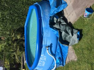‘Ik zet dat ding nu op’, mompelde hij en voor ik het wist was-ie met het zwembad in de weer. Alle bijbehorende spullen – inclusief speciale pompen en zakken zout – werden uit het hok getrokken.