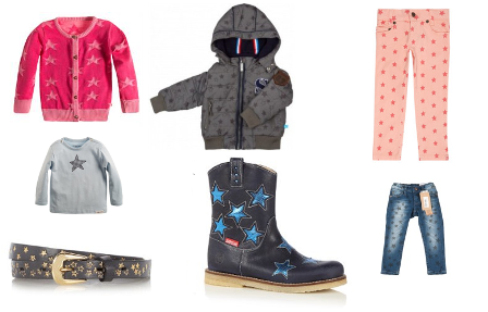 Afbeelding ( van links naar rechts): roze meisjesvest (29,99), grijs jongensshirt (11,99), riem (10,46), winterjas voor jongens (39,95), blauwe laarzen (99,95), roze broek met sterrenprint (39,95), jeans met sterrenprint (27,45)