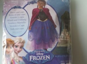 Die twee exemplaren bestelde ik bij Bol.com. De volgende dag had ik ze al in huis. Althans, het pakket. Want inderdaad, het jasje van de peuter zat erin. Het roze jasje ontbrak. Wel zat er een prachtige Frozen jurk met cape in. Of all places kwam-ie hier. Bij mijn Frozen minnende meisjes die van verkleden hun hobby hebben gemaakt.