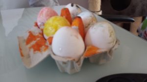 Vorig jaar kreeg mijn kleuter tijdens het paaseieren beschilderen een heuse woede-aanval. ‘Dit doen we niet weer’, dacht ik nog. Maar ach, ik heb ‘t talent dat ik snel vergeet wat voor mislukking iets ook alweer was, dus dit jaar gingen we in de herhaling. En het lijkt beter te gaan.