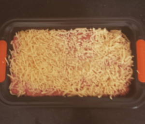 Lekker dat gehakt plat stampen in de schaal, je kunt nog een beetje paneermeel erover uitwrijven voor een krokant laagje en dan afmaken met een laagje kaas ( ik gebruik zelf altijd dat poederige parmesan, al is gewone geraspte kaas ook prima).