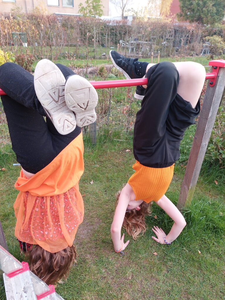 Mijn dochters leerden elkaar allerlei moeilijke dingen op de rekstokken in onze tuin. Volgens mij waren dat de spannendste momenten van de dag. Vooral omdat oudste dochter eindigde met een bult op haar hoofd.