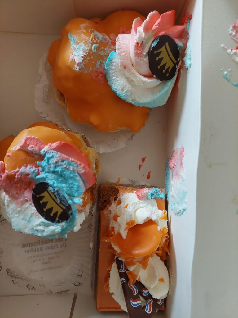 Ook kochten we taartjes voor Koningsdag. Al overleefden ze met moeite de fietsrit. Ze smaakten er niet minder om: