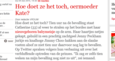 Al dagen lees ik in mijn timelines van Twitter en Facebook verontwaardigde reacties over 't feit dat Kate Middleton - beter bekend als de Hertogin van Cambridge- afgelopen zondag - ongeveer tien uur na haar bevalling - al trots en stralend haar dochter aan de wereld liet zien. … [Read more...] about Kate Middleton is niet uniek: bevallen hoeft geen hel te zijn.