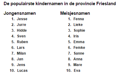 'Weet jij ook wat de populairste kindernamen hier in Friesland zijn?' vroeg iemand mij nog afgelopen weekend. Ja, dat wist ik. Niet omdat ik zo'n goed geheugen heb - ik heb momenteel juist een geheugen als een zeef - maar omdat de Sociale Verzekeringsbank ( SVB) zo aardig is … [Read more...] about De populairste kindernamen in Friesland in 2014